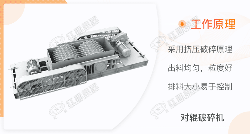 將破碎物料經(jīng)給料口落入兩輥子之間,進行擠壓破碎,成品物料自然落下。遇有過硬或不可破碎物時,其輥子可憑液壓缸或彈簧的作用自動退讓,使輥子間隙增大,過硬或不可破碎物落下,從而保護機器不受損壞。相向轉(zhuǎn)動的兩輥子有一定的間隙,改變間隙,即可控制產(chǎn)品排料粒度。